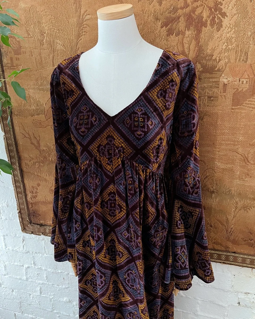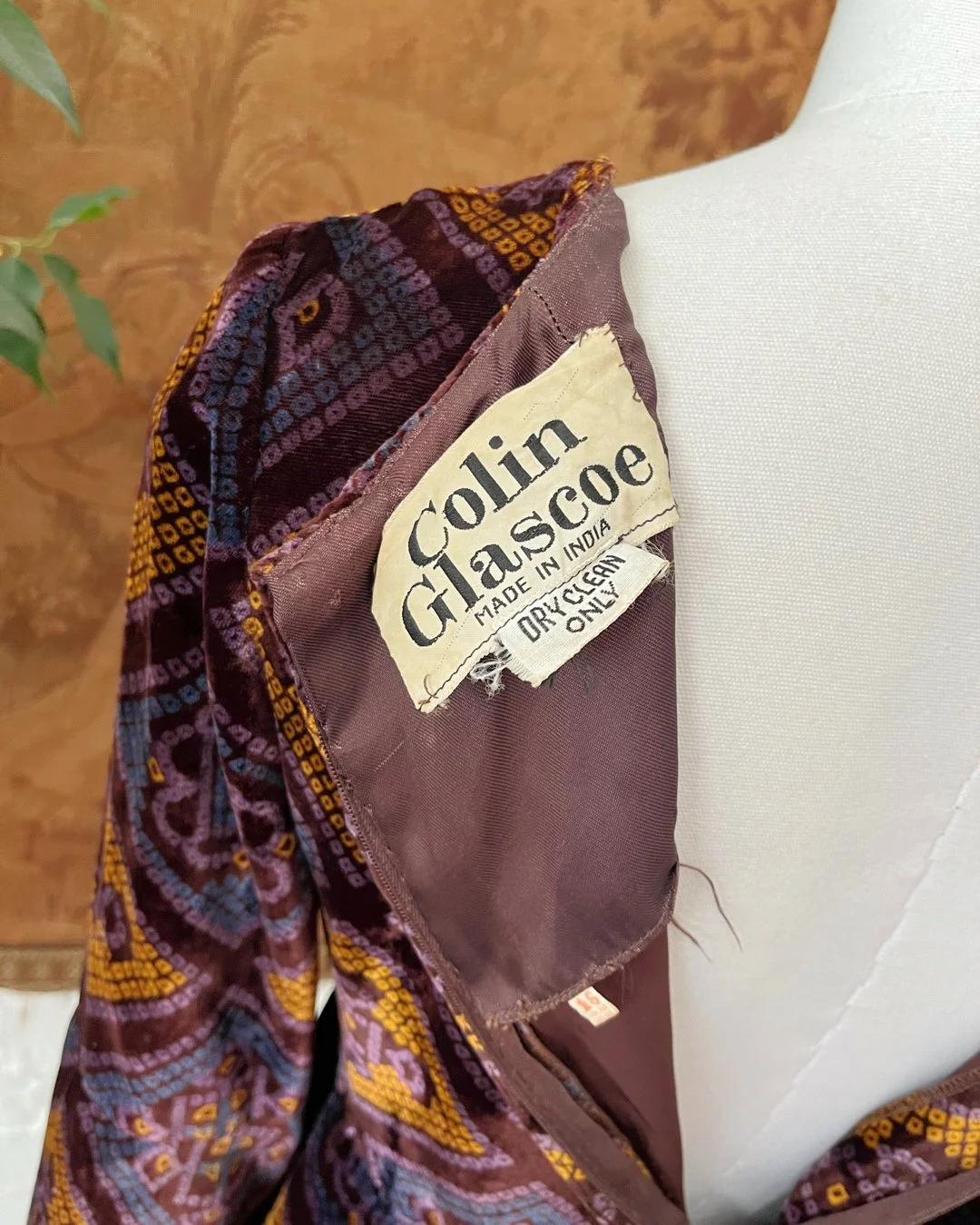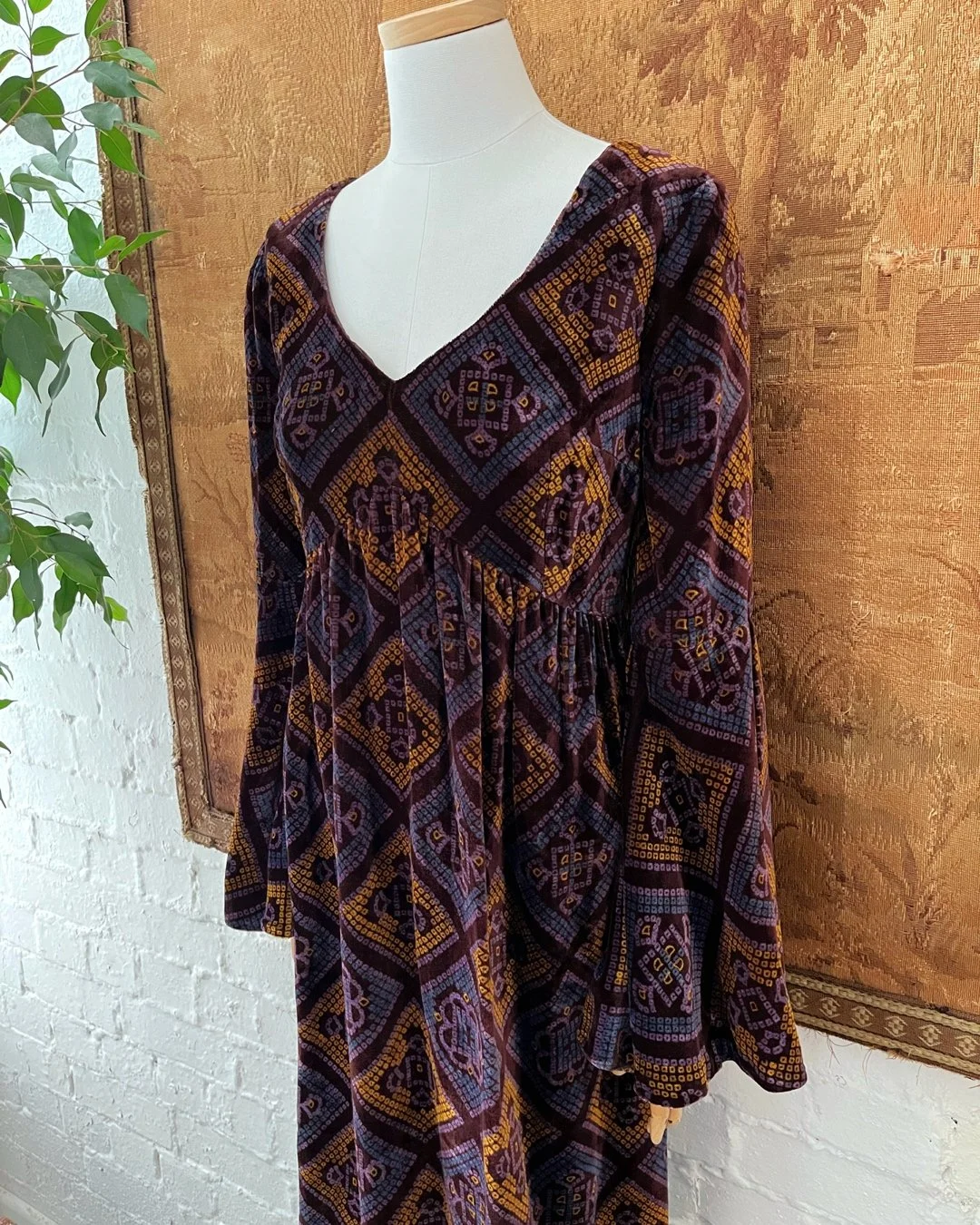 Wonderful 1970s velvet maxi dress by Colin Glascoe. Lovely purple & orange patchwork diamond print throughout. V shaped neckline & flared angel sleeves. Fully lined with a rear zip closure. Size 10-12.