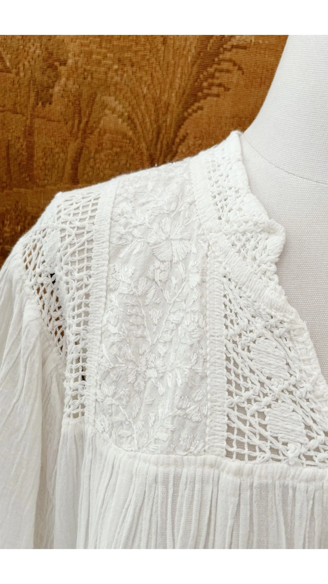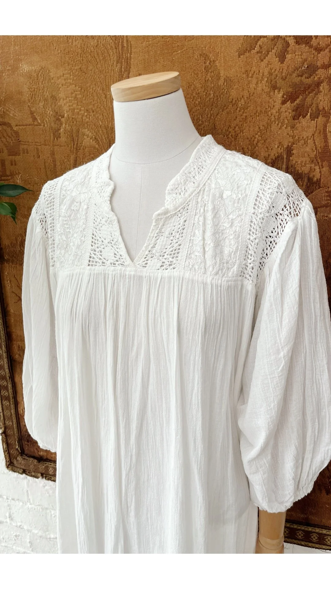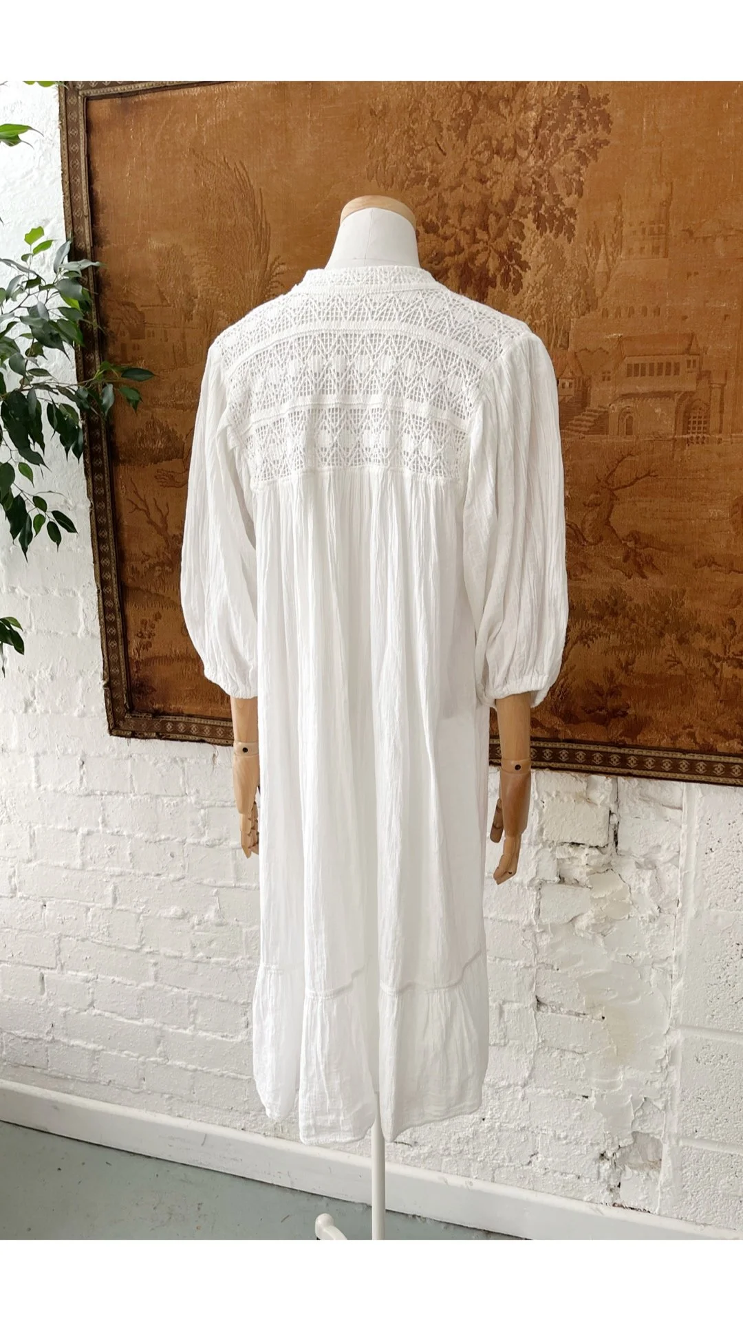 Lovely 1980s white cotton gauze smock dress. Midi in length with very pretty embroidery & crochet detail to the yoke & 3/4 ballooned sleeves. Size 10-16.