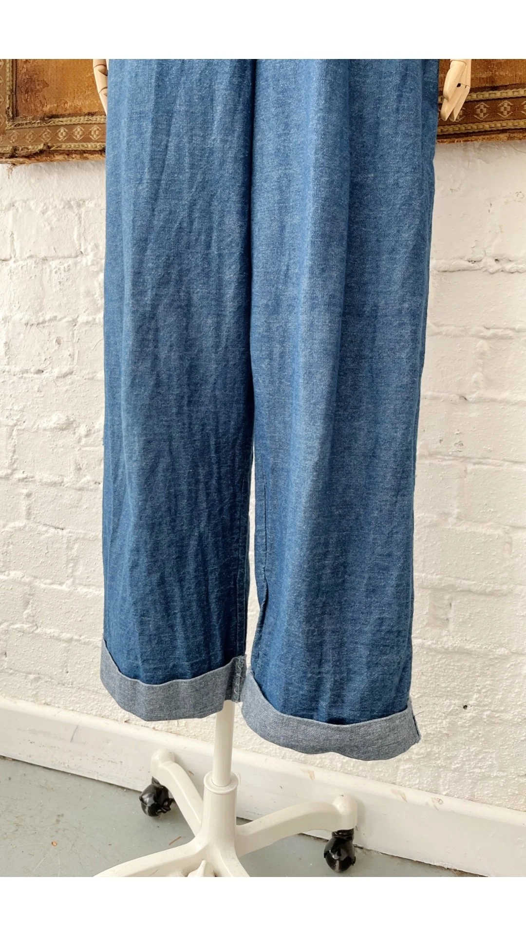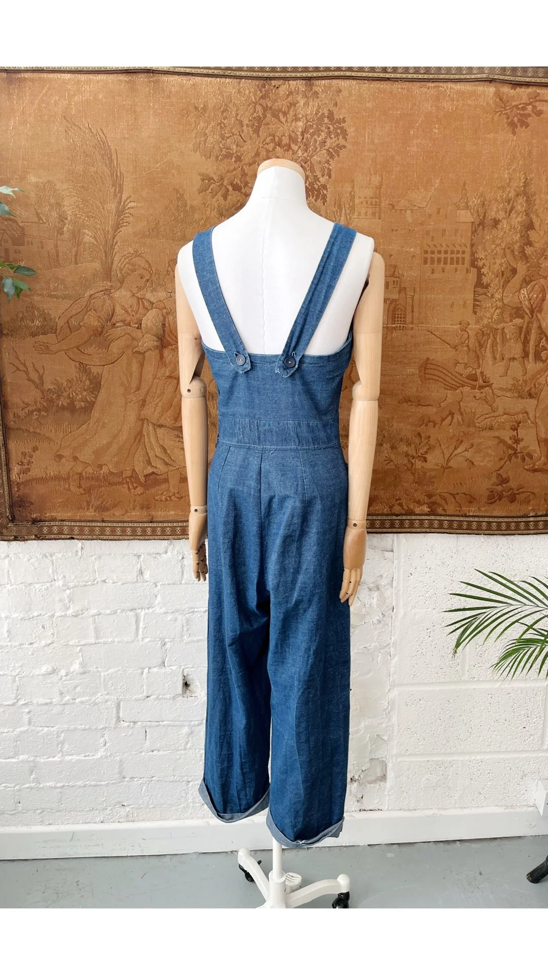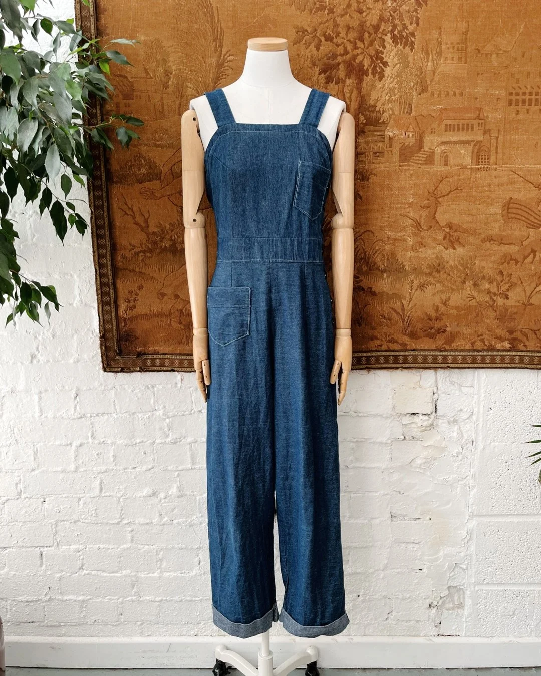 Amazing 1980s handmade dungarees. Lovely soft indigo blue denim in colour. Assymetrical pocket detail to front with chunky straps & button up closure to the side. Wide leg trousers with fold over hem. Size 10-12.