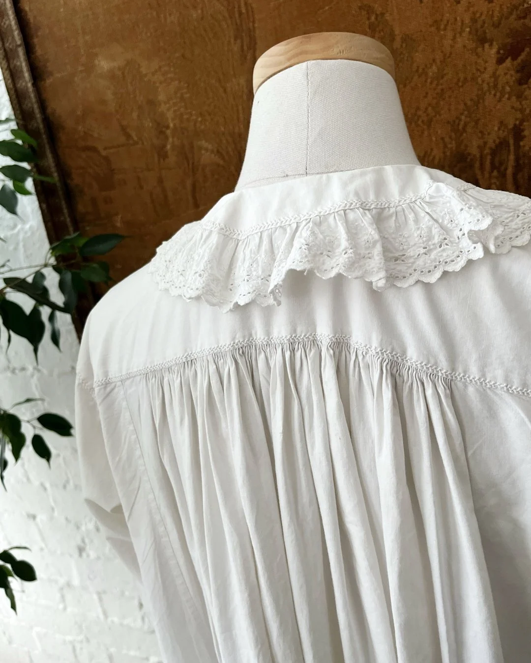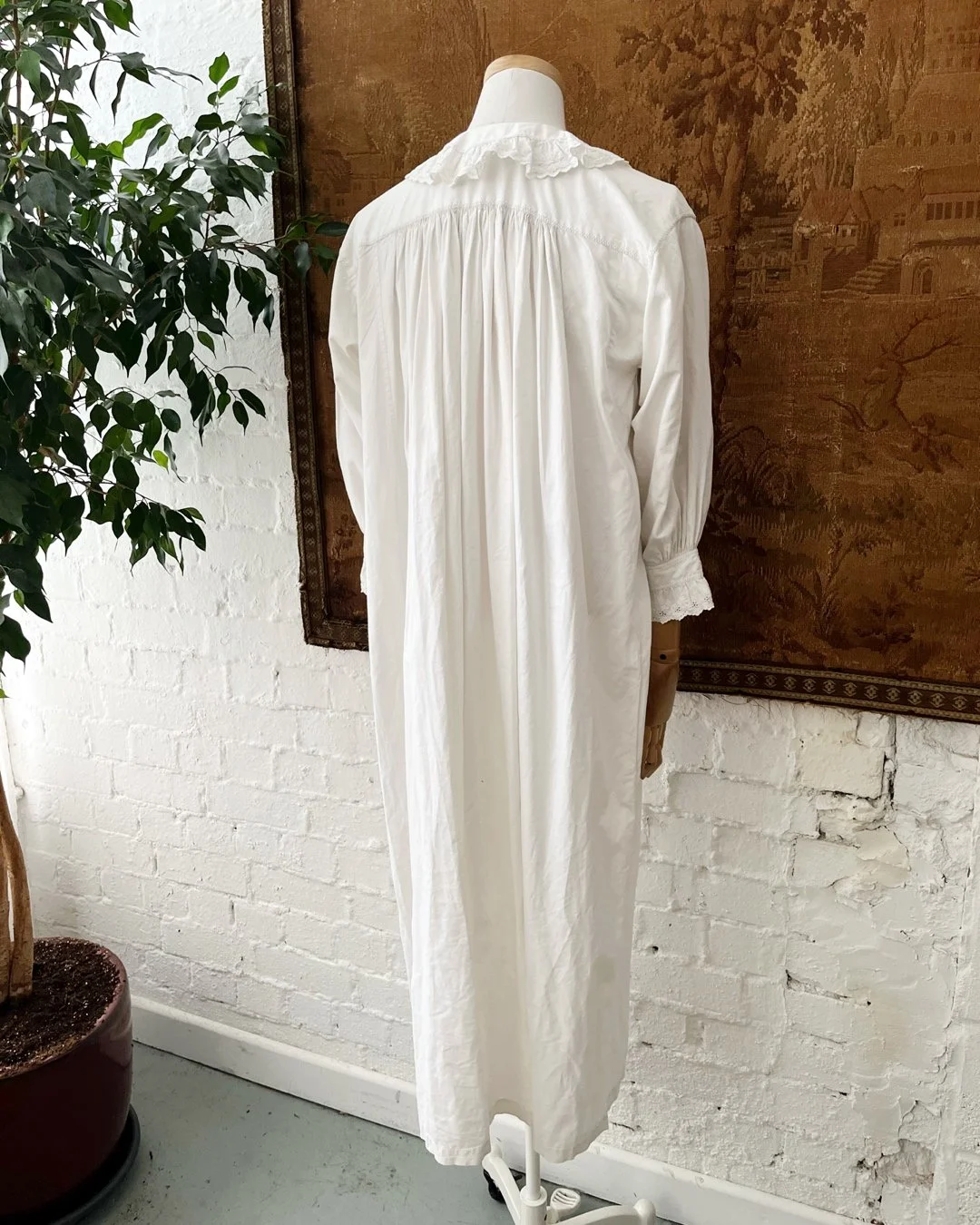 Antique Edwardian White Cotton Broderie Anglaise Ruffle Trim Pintuck Panel Smock Nightdress