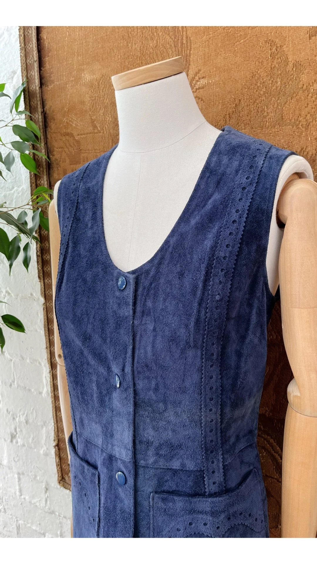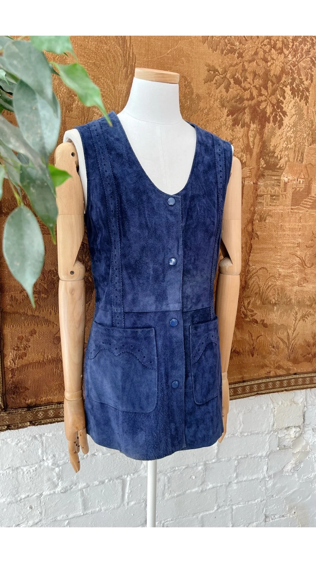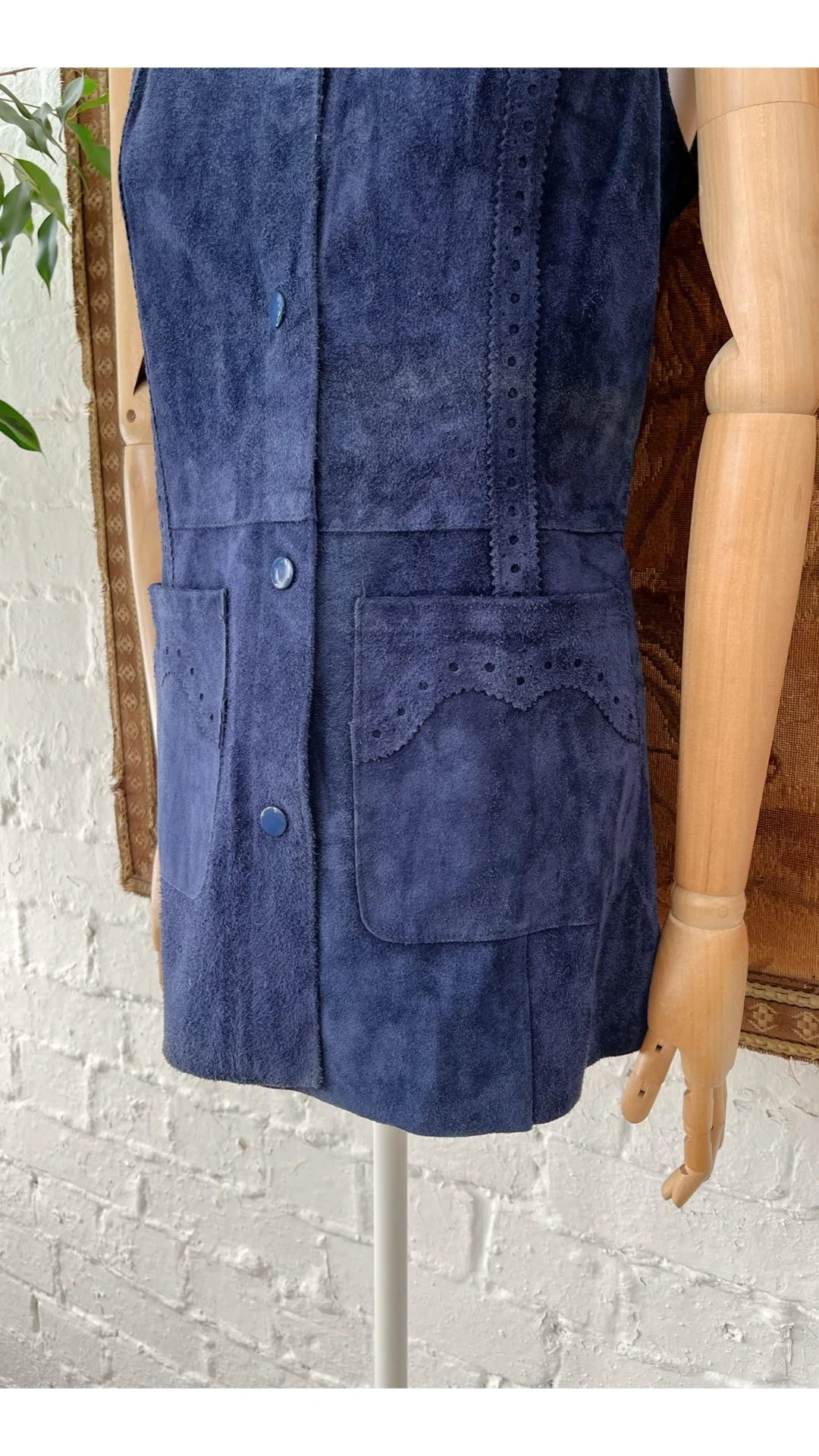 Amazing late 1960s deep navy blue suede waistcoat. Popper front closure & lovely embroidered cut out trim pocket detail. Size 10-12.