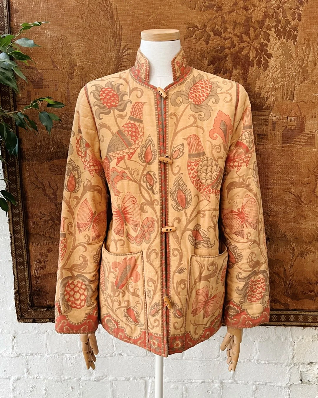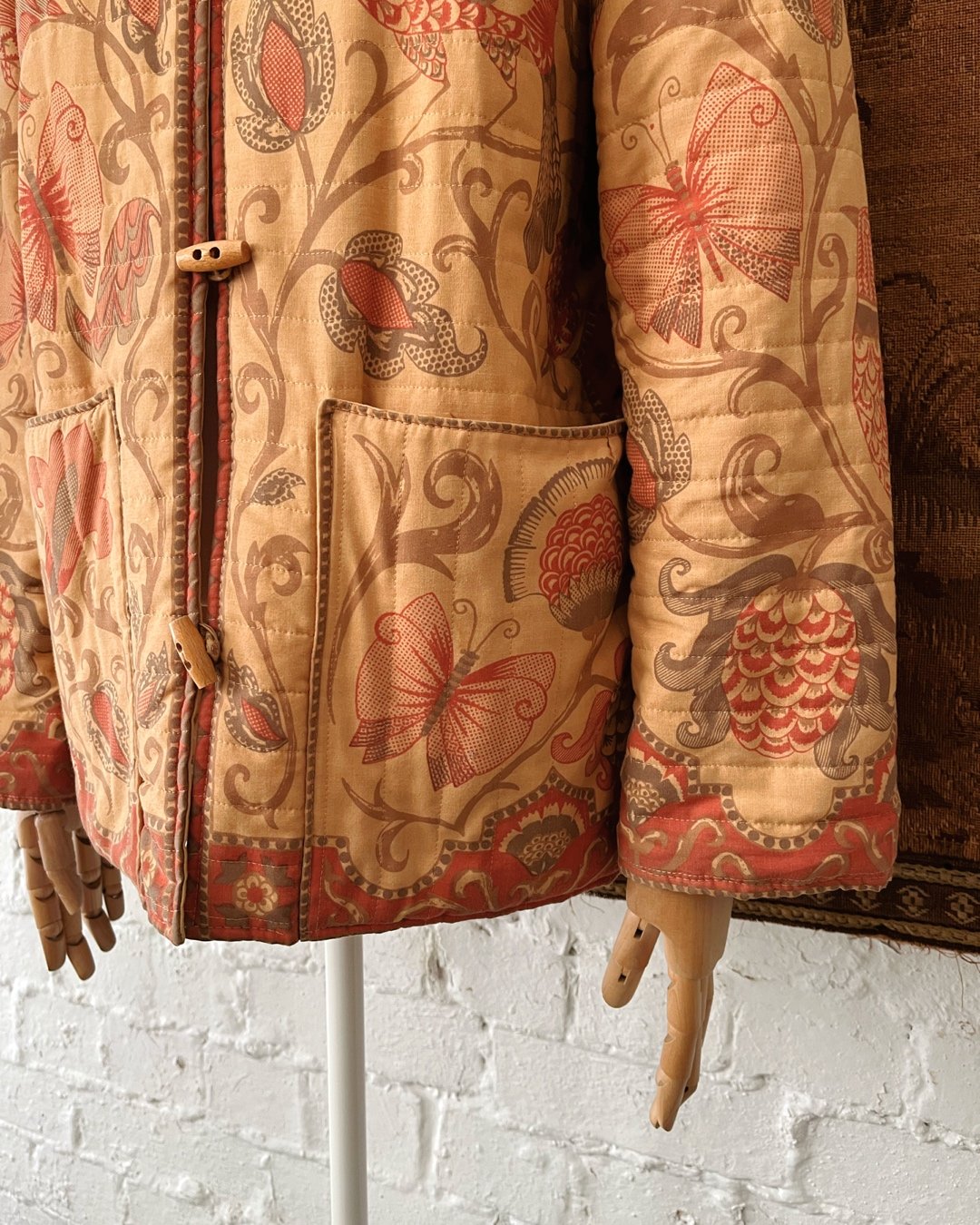 An amazing 1980s cosy Clothkits quilted jacket. Lovely soft peach in base colour with grey & muted orange. Gorgeous print featuring pretty florals, butterflies & birds. Wooden toggle closure & open pockets either side of the hip. Size 12-14.