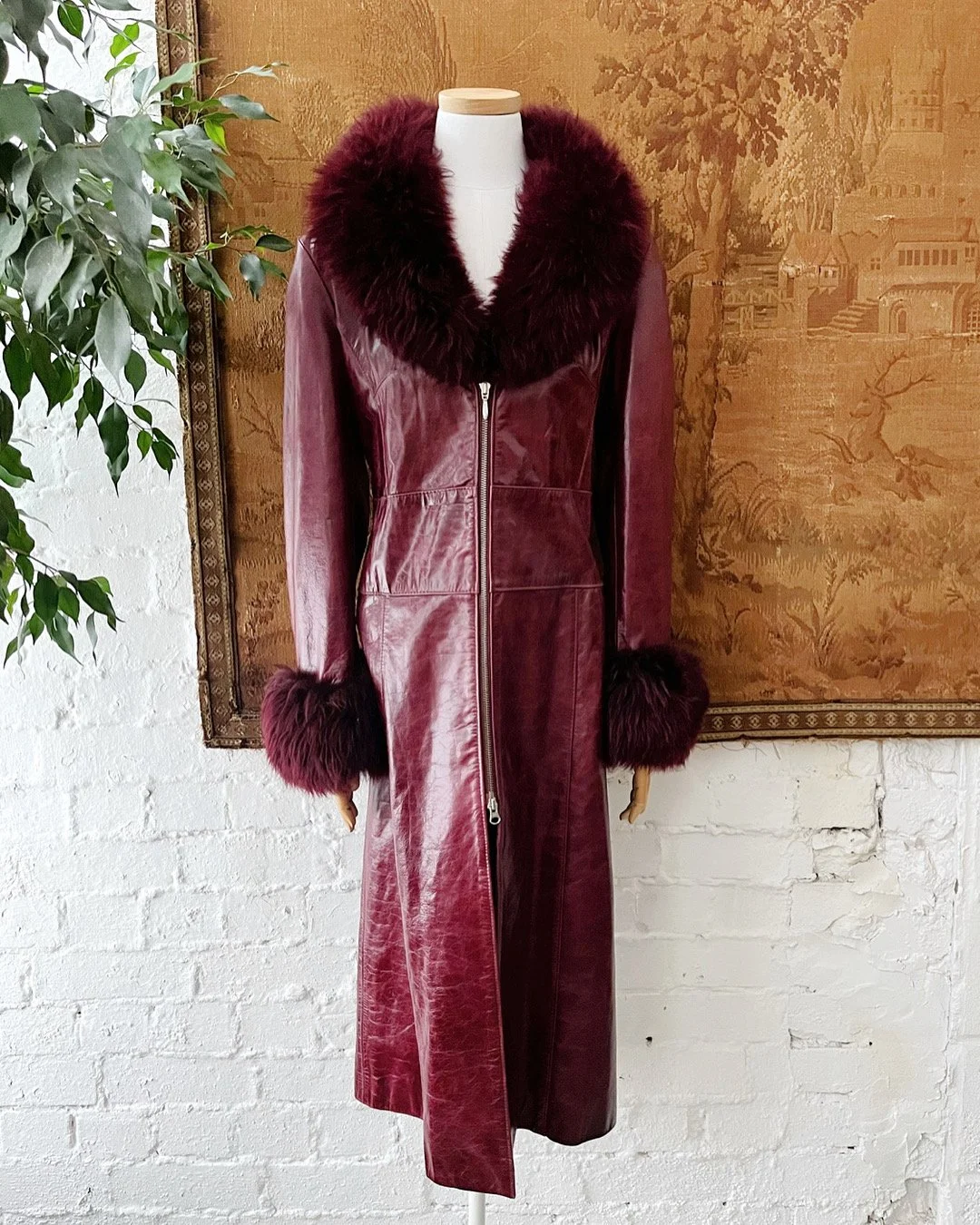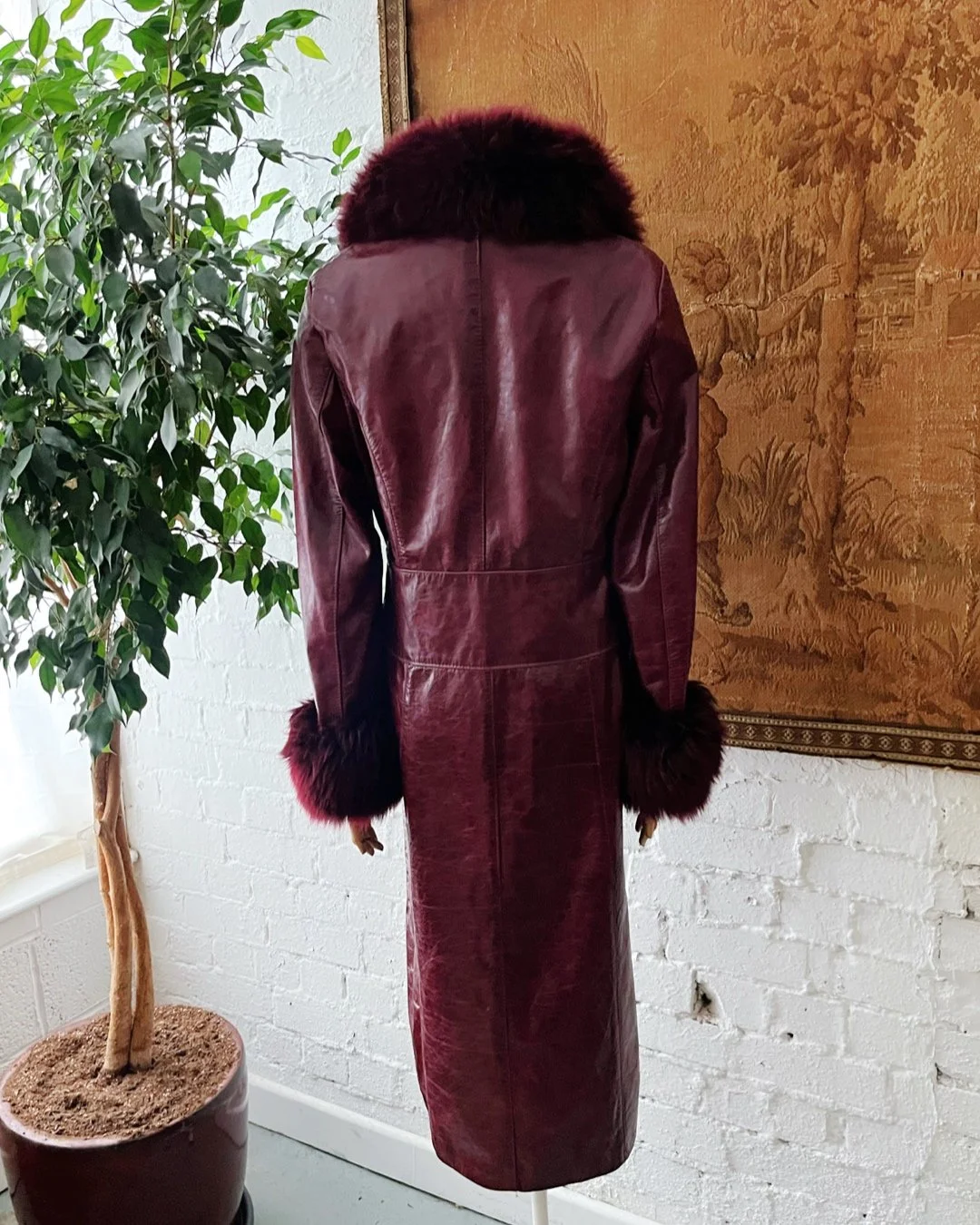 1970s Deep Burgundy Leather Fur Trim Full Length Coat 12 14