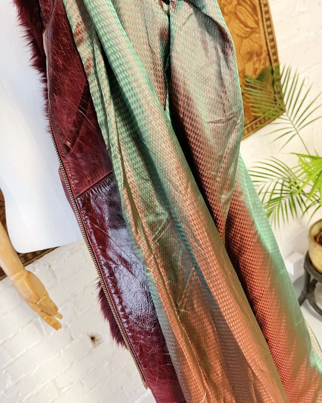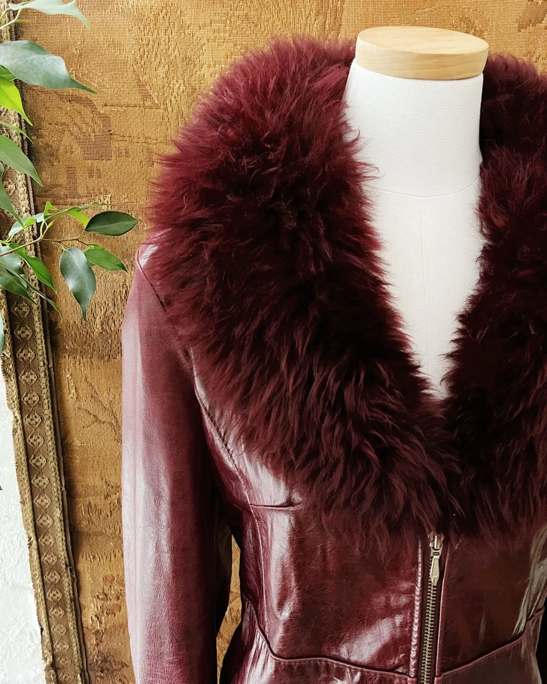Amazing late 1970s deep burgundy patent leather coat. Super fluffy collar & fur trim cuffs, zip closure to front with pockets either side of the hip. Fully lined in a gorgeous iridescent fabric. Size 12-14.