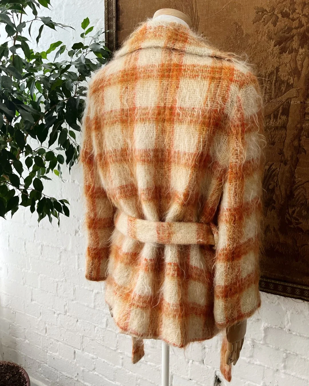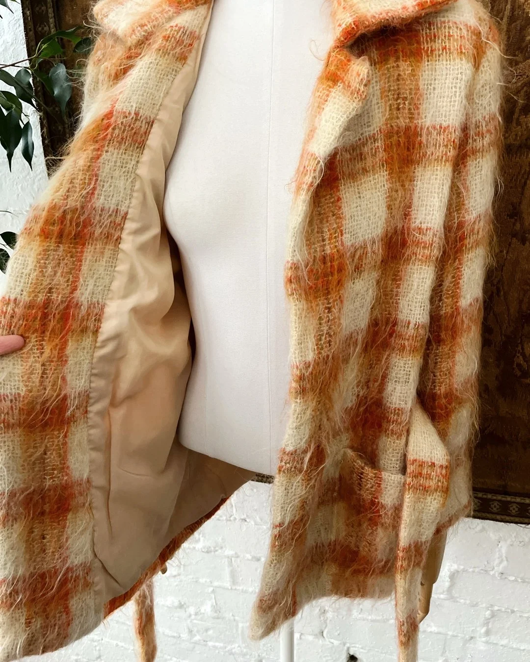 1970s Orange & Cream Tartan Check Mohair Fluffy Jacket 10 12 14