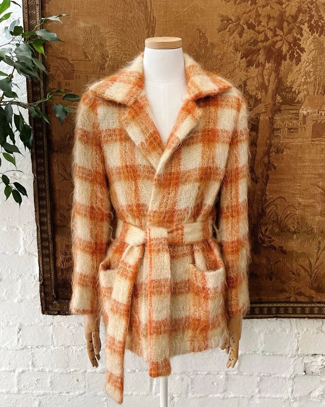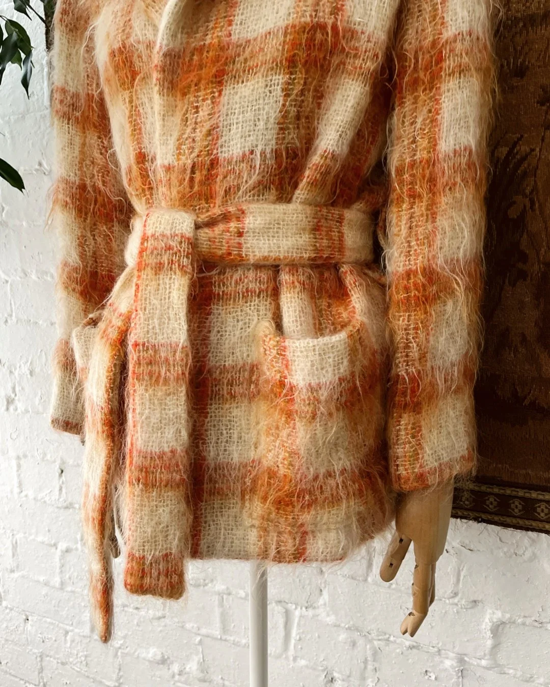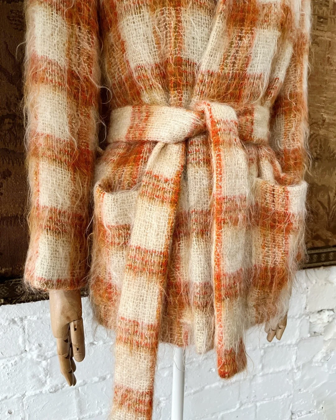 Beautiful 1970s fluffy mohair jacket. Cream & Orange check throughout with pockets either side of the waist, an open front & tie closure. Fully lined. Size 10-14.