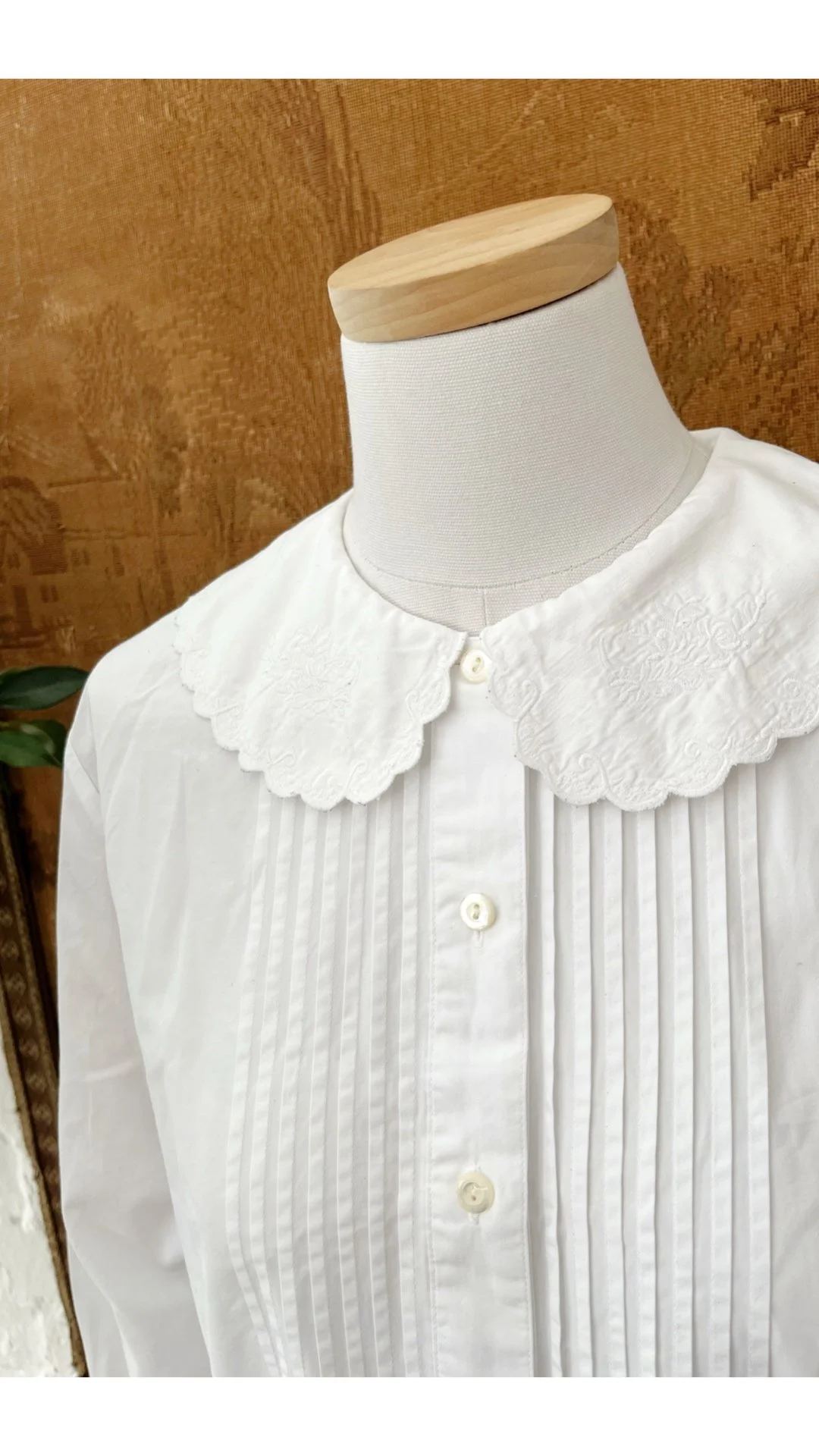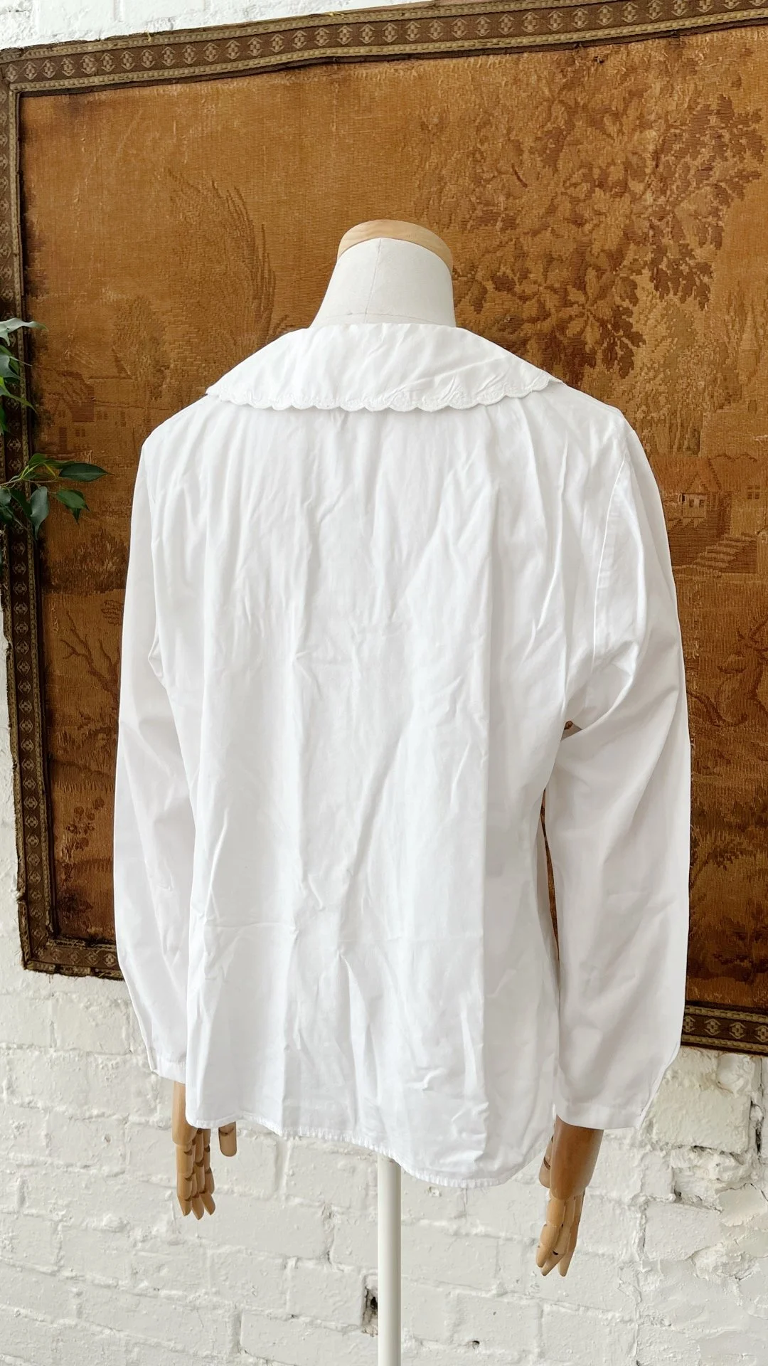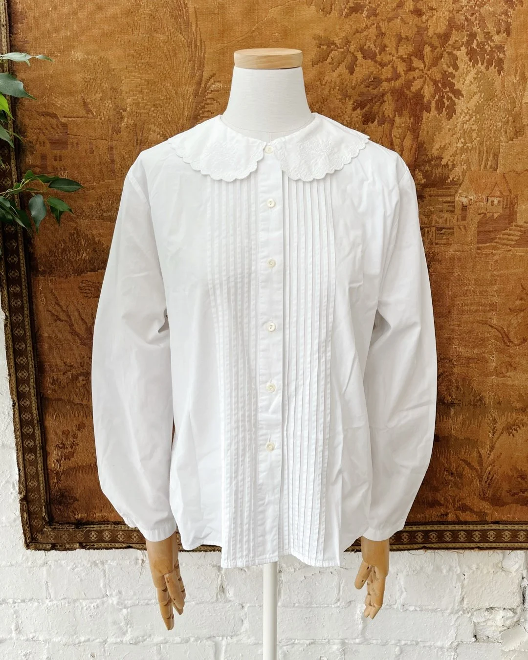 Really pretty 1980s Laura Ashley white cotton blouse. Beautiful oversized collar with embroidery detail & scallop trim. Button up front closure & pintuck pleats either side. Size 12-14.