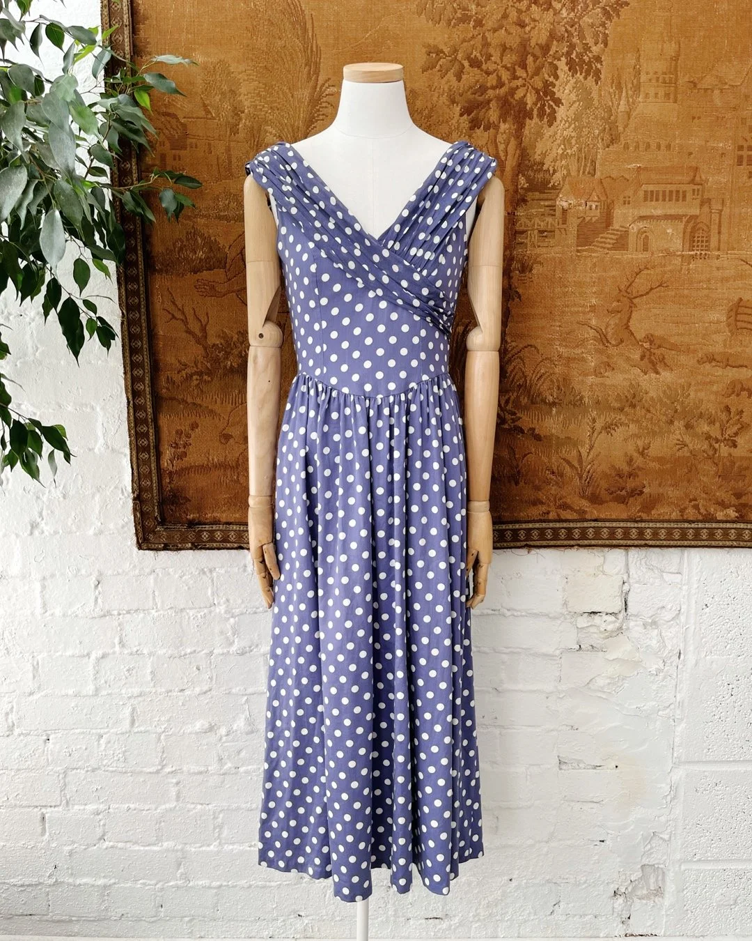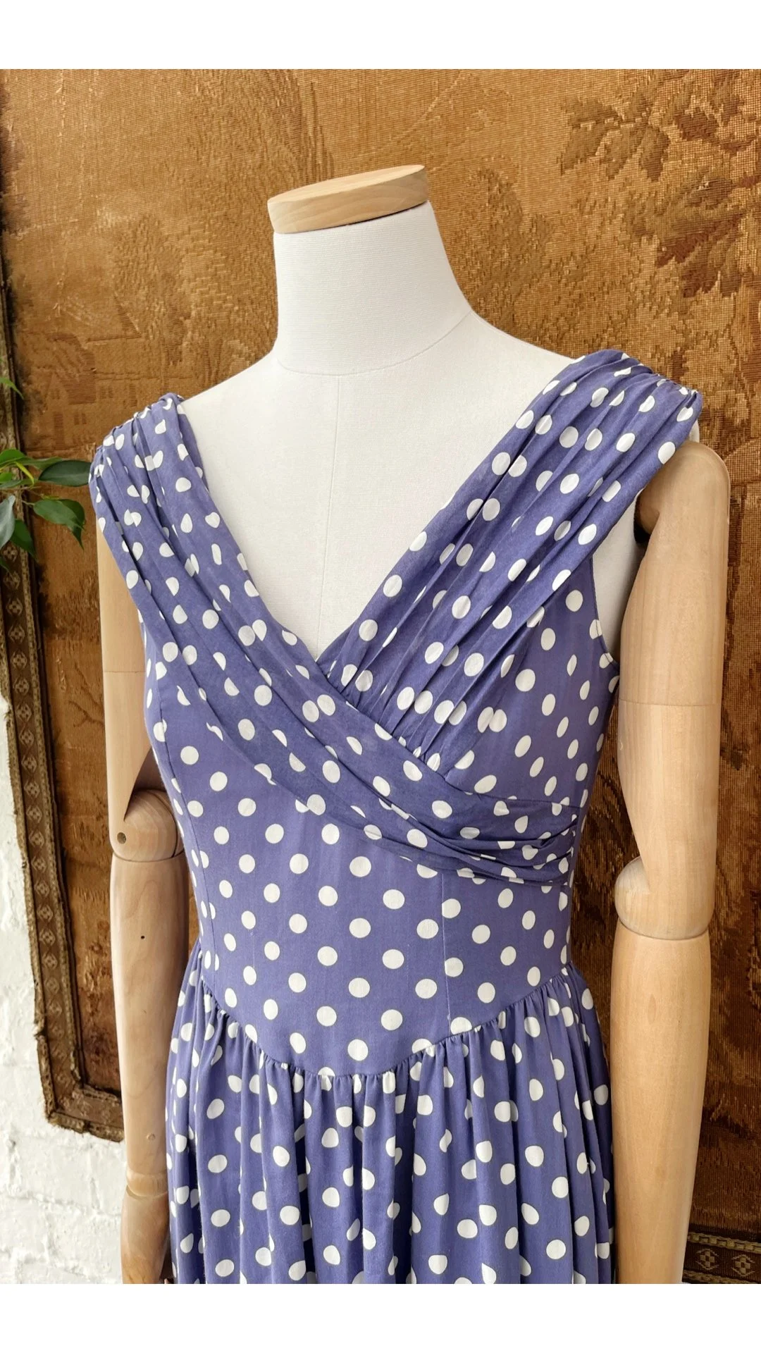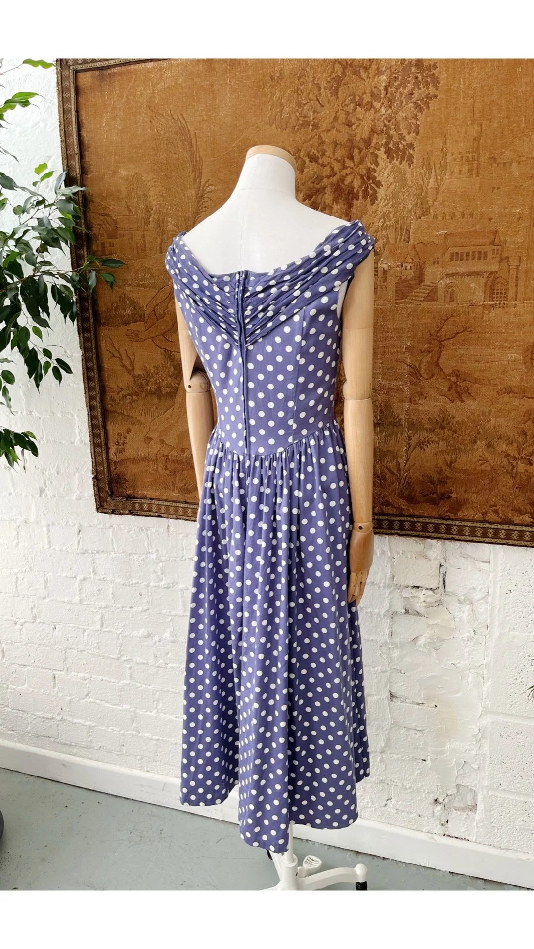 1980s Laura Ashley Cornflower Blue & White Polka Dot Ruched Strap Midi Dress 10