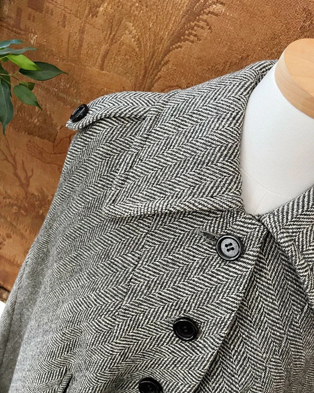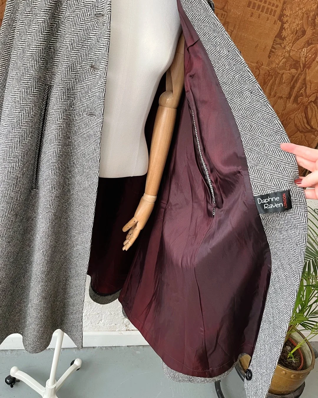 A beautiful 1960s herringbone wool cape by Daphne Raven. Classic black & white tone throughout with black button up front closure. Arm slits to each side & fully lined. Size 8-12.