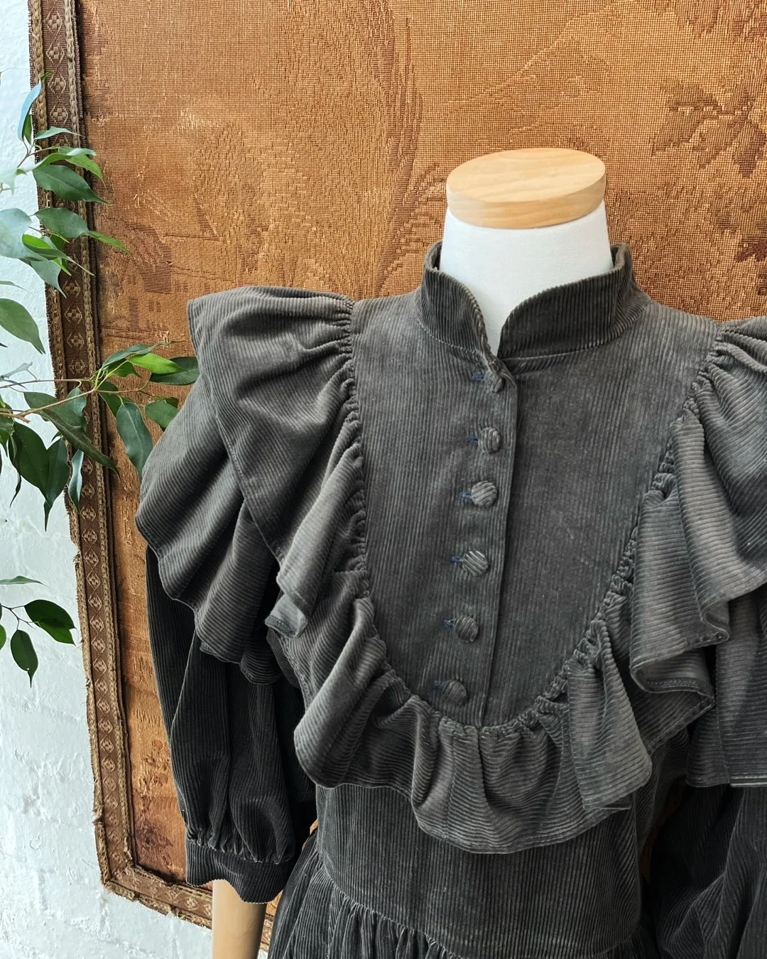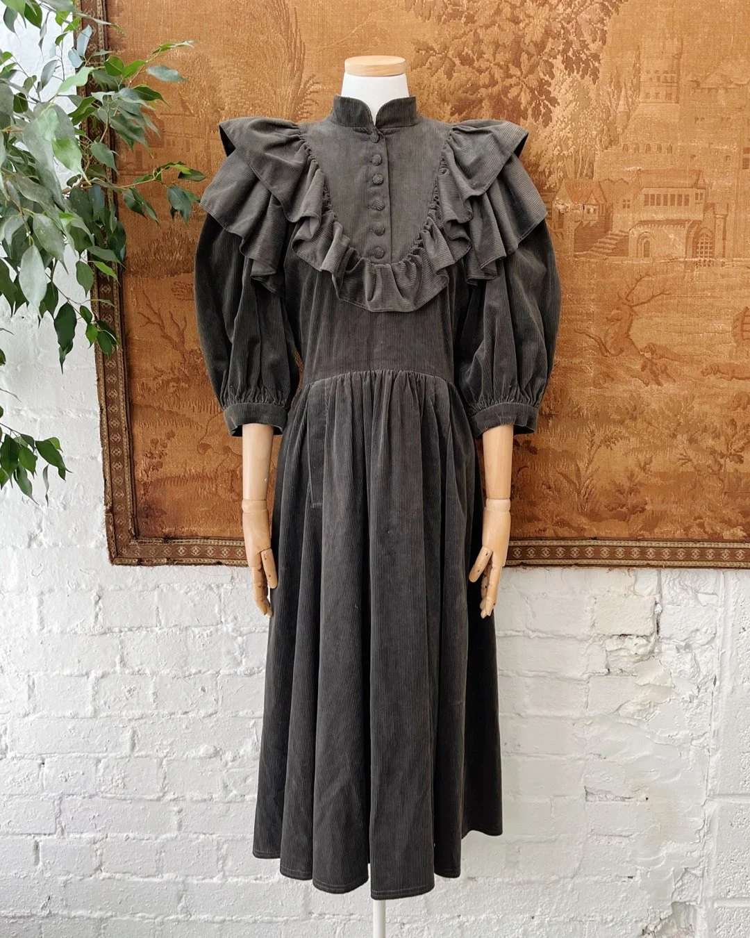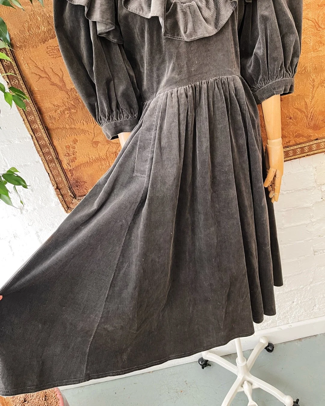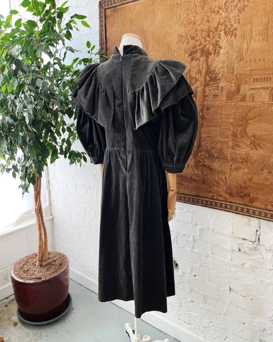 Amazing early 1980s slate grey corduroy velvet dress by Droopy & Browns. Wonderful large ruffle trim with button up detail at the yoke & dramatic puff sleeves. Tight pleats at the waist for a lovely movement through the skirt with pockets either side of the hip. Rear zip closure. Size 12-14.