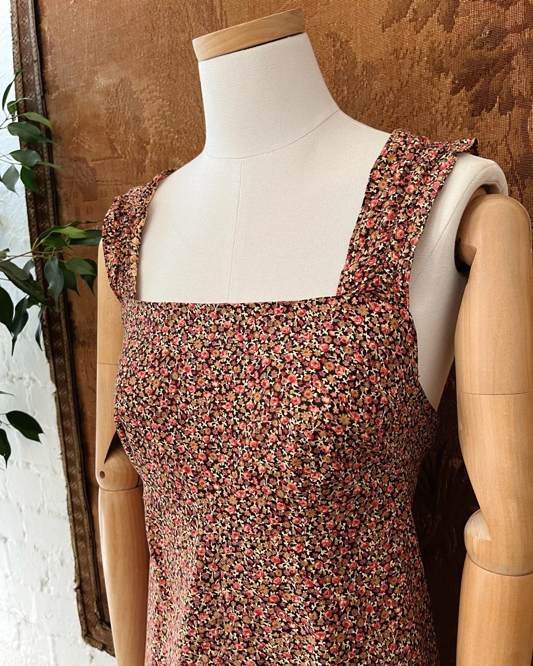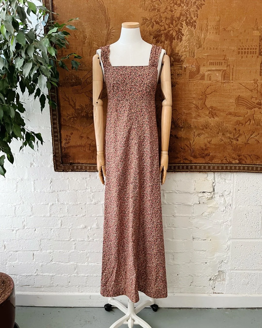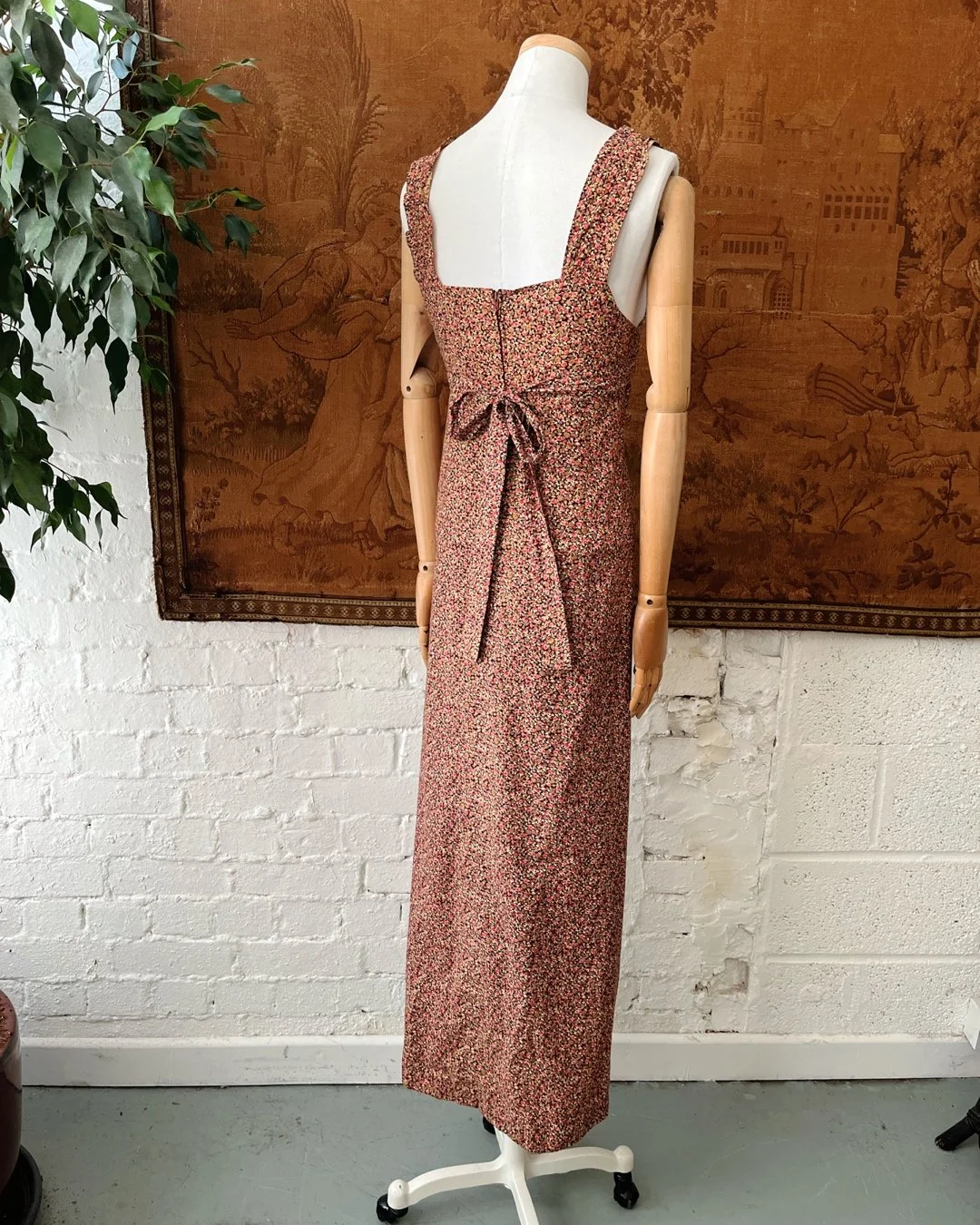 A gorgeous 1970s maxi length cotton sundress. Super pretty pink & black ditsy floral print fabric throughout with a square shaped neckline, high empire line & a tie at the rear that cinches to fit the wearer. Size 12-14.