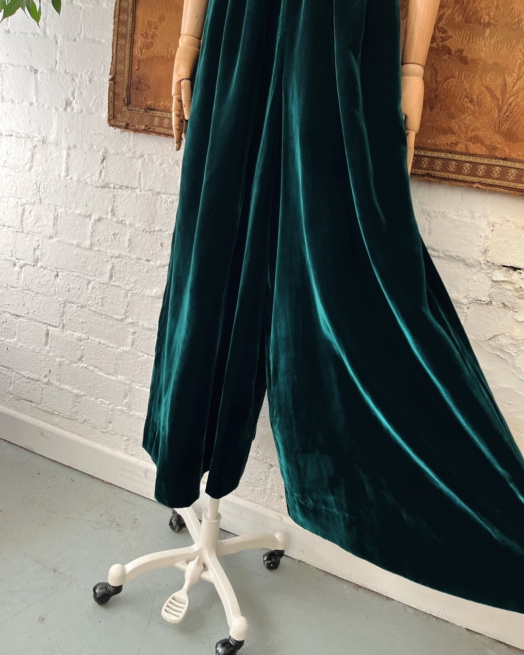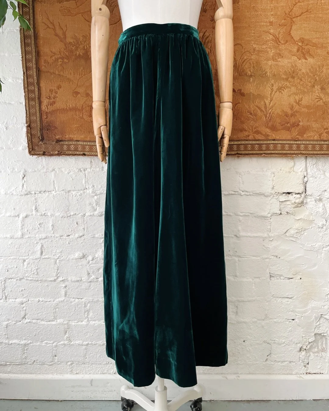 Early 1970s Hardy Amies Savile Row Emerald Green Silk Velvet High Waisted Wide Leg Palazzo Trousers 6 8