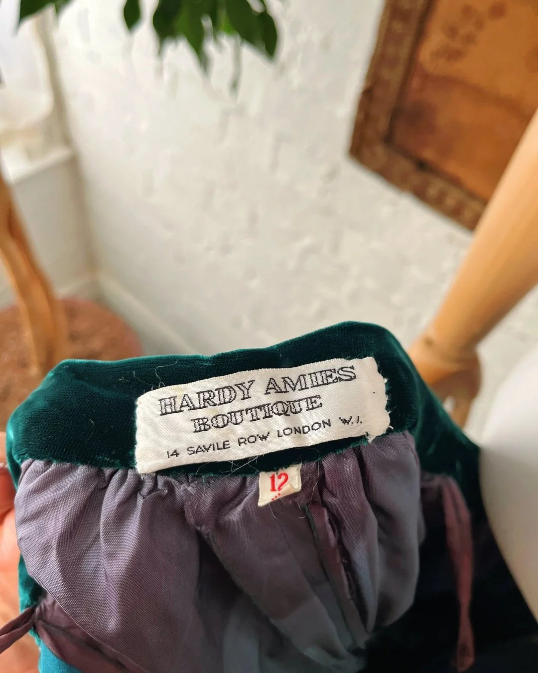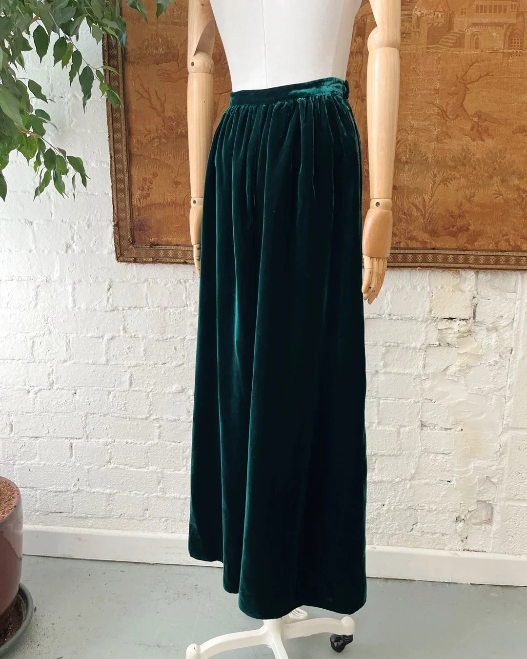 Truly incredible early 1970s high waisted trousers by Hardy Amies of Saville Row. Deep emerald green velvet fabric throughout with a super high waisted fit & huge wide legs creating the most amazing movement when worn. Side zip closure with hook & eye to cinch. Size 6-8.