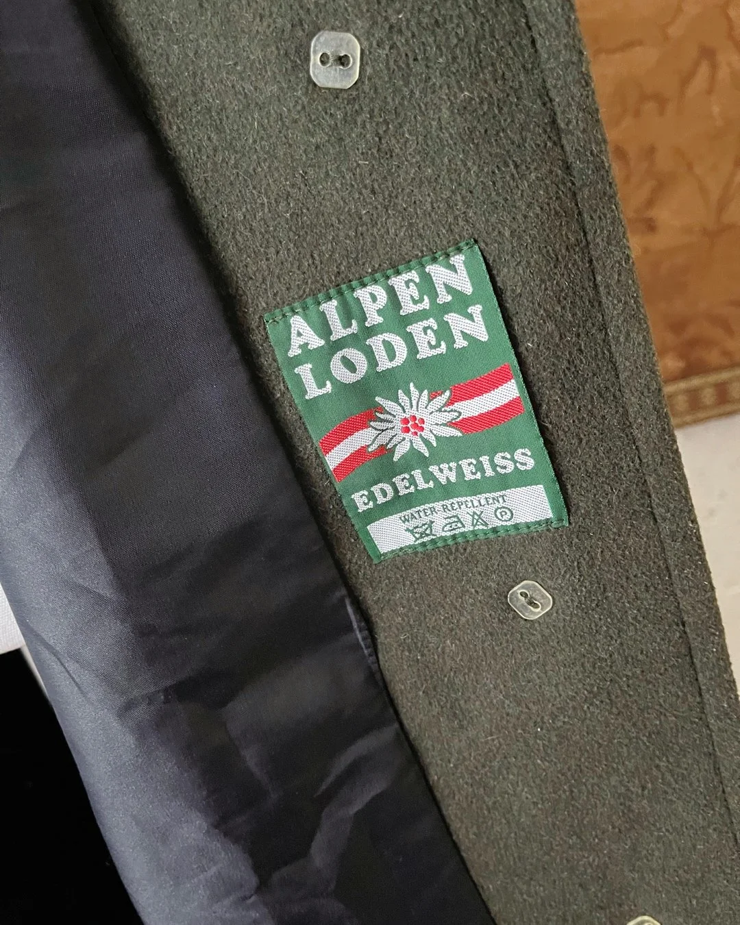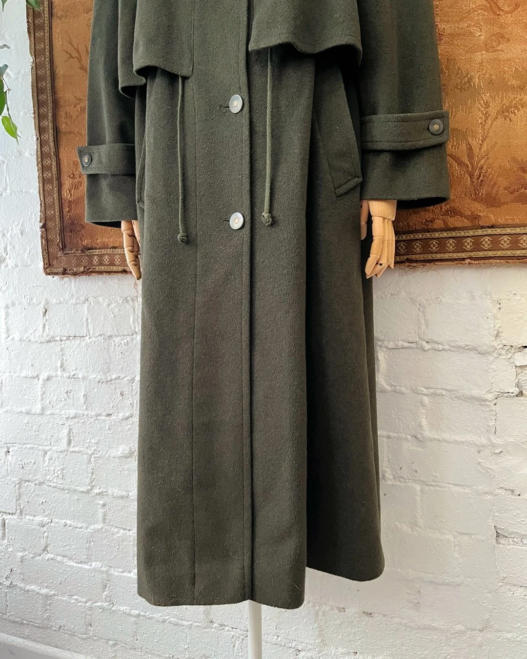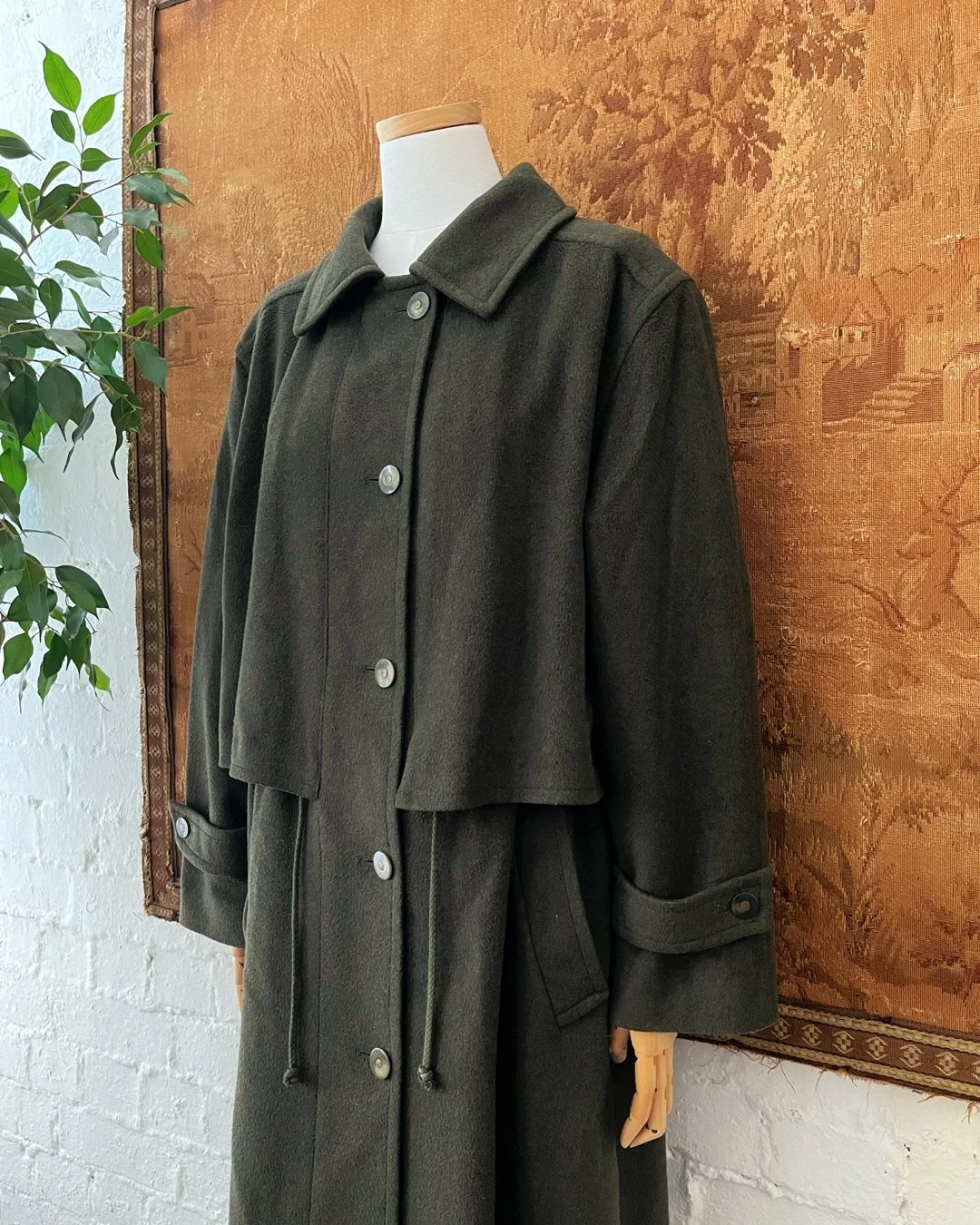 Gorgeous quality 1980s Alpen Loden khaki green wool coat. Lovely soft cosy wool with a drawstring to the waist to cinch and a single run button closure. Fully lined. Size 14-16.