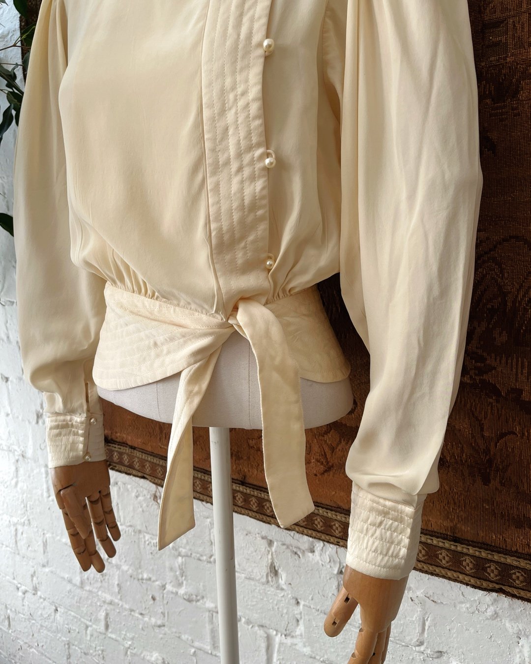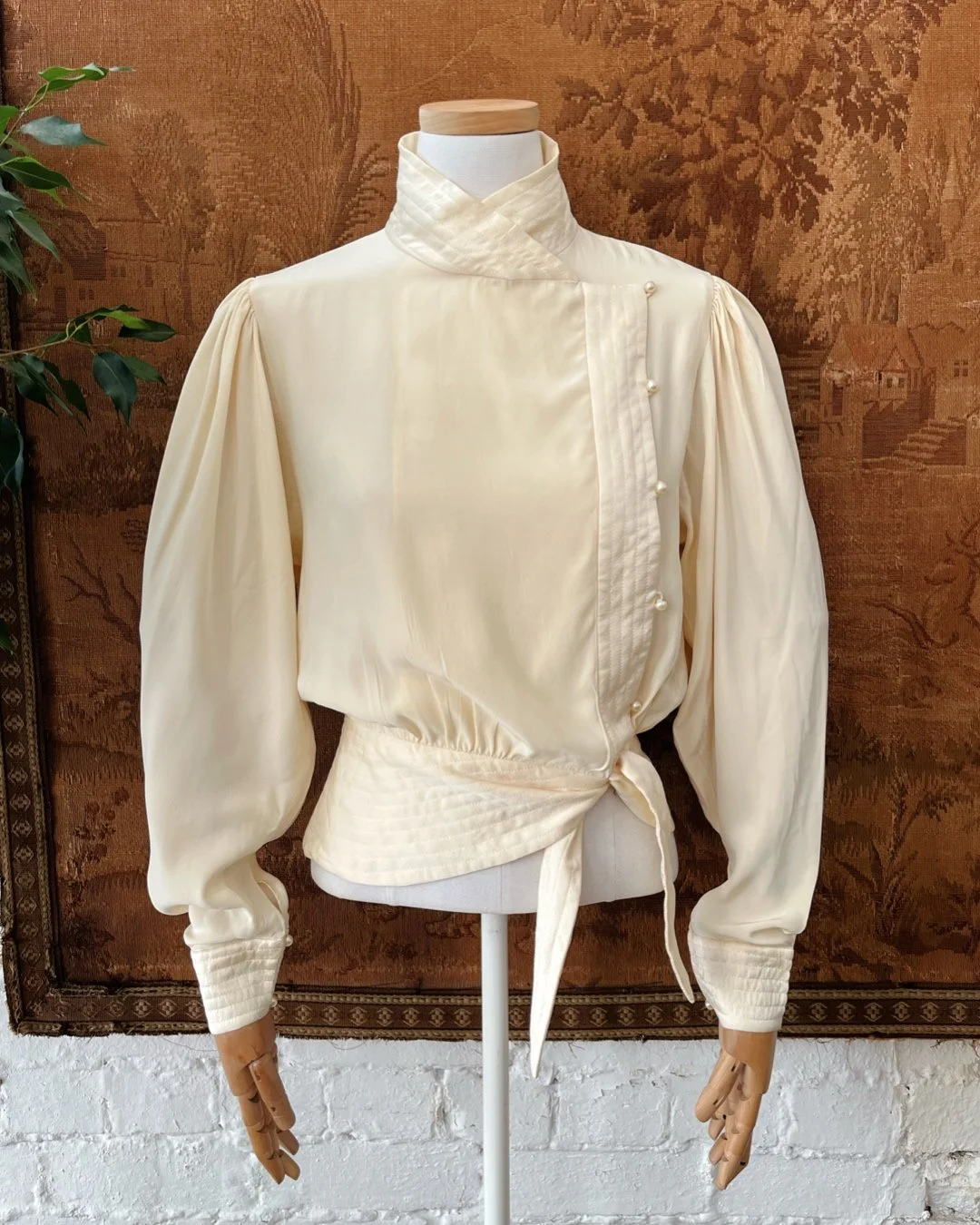Stunning 1980s cream silk blouse by Christina Stambolian. Gorgeous silhouette of large balloon sleeves with tights cuffs & cropped in length. Asymmetrical pearl effect button up detail to the crossover quilted neck & a tie at the waist to cinch as desired. Size 8-10.