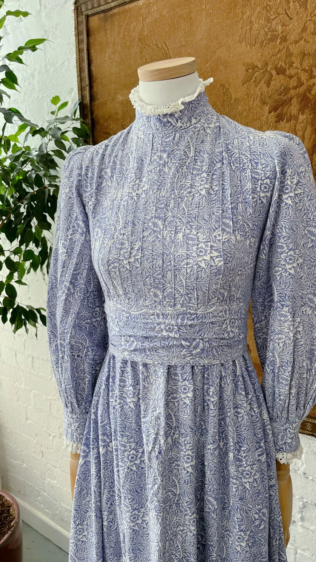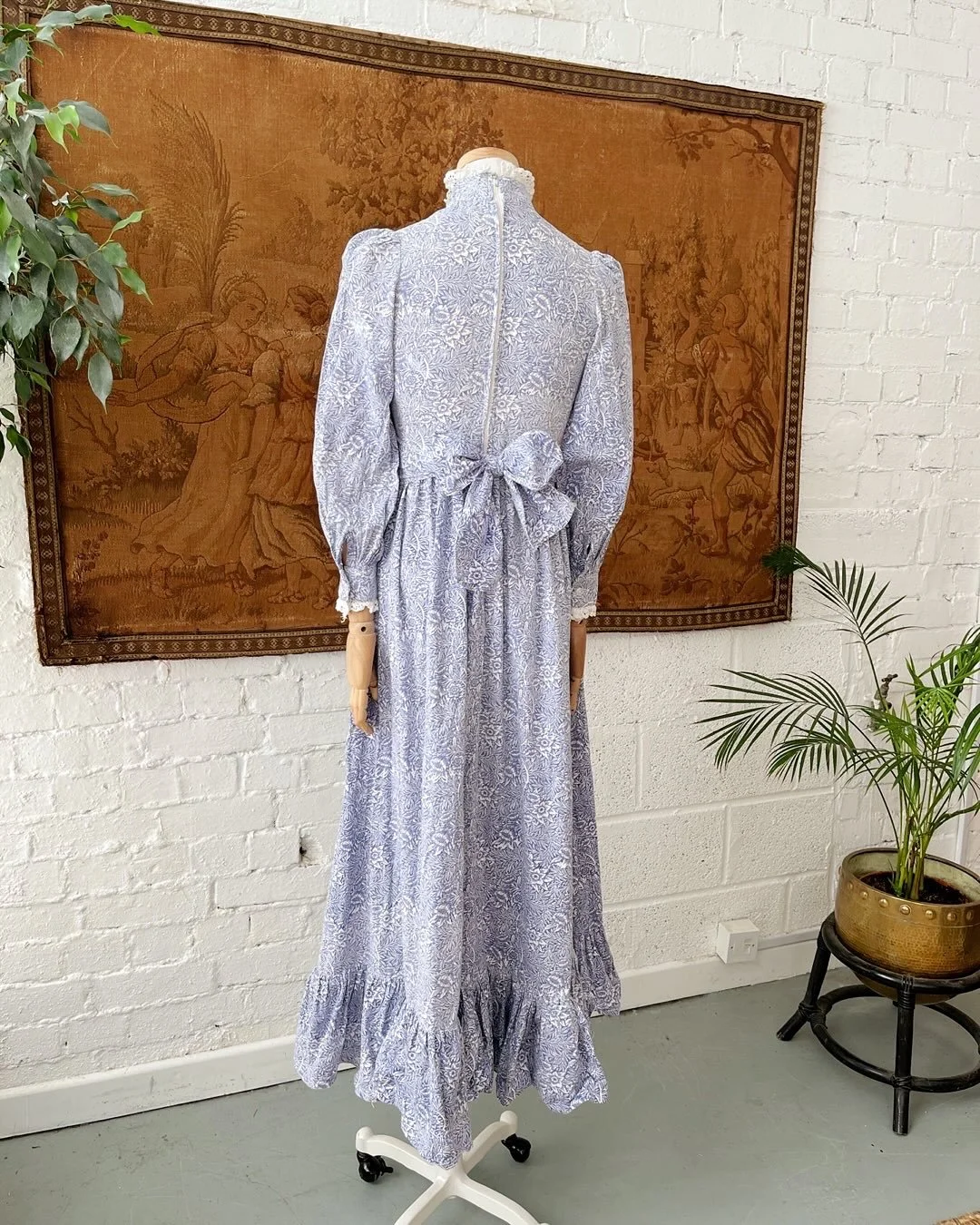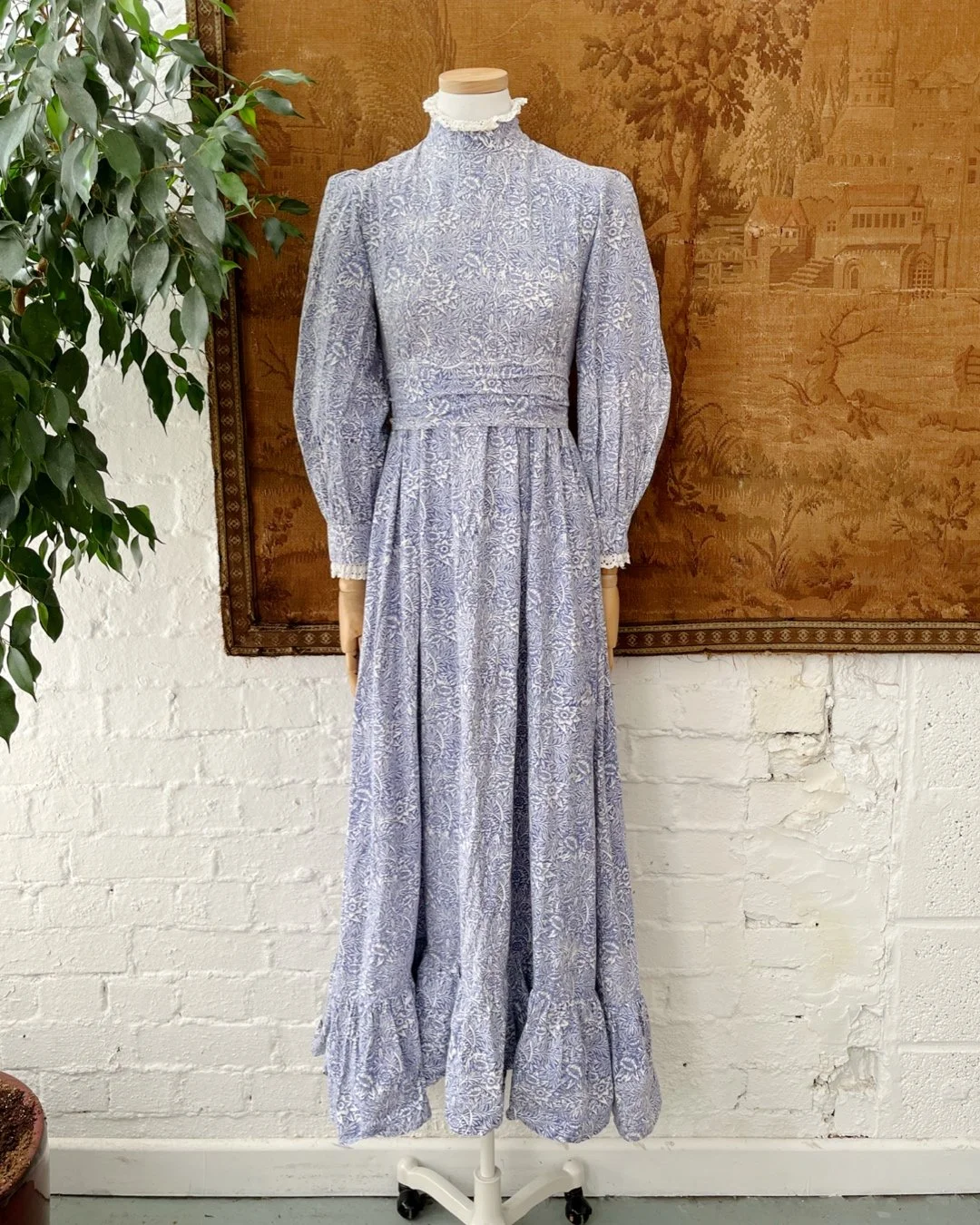 A wonderful 1970s Laura Ashley maxi dress. Beautiful rare William Morris floral print throughout in soft cornflower blue & white. Pretty crochet trim to the high neckline & cuffs with slightly ballooned sleeves & a long sweeping skirt complete with ruffle tiered trim. Rear zip closure & sash waist tie to cinch as desired. Size 8-10.